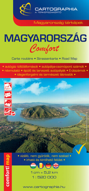 A Cartographia kiadó népszerű Comfort térképsorozatának tagja 1:520000 méretarányban ábrázolja Magyarországot.