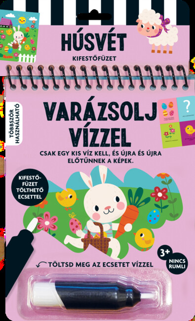 Töltsd meg vízzel a tollat, és hívd elő a képek elemeit, így lesznek teljesek az oldalak, és megválaszolhatod a füzet kérdéseit. Ha a foltok megszáradnak, újra fehérek lesznek, és kezdheted elölről, amikor csak kedved tartja.