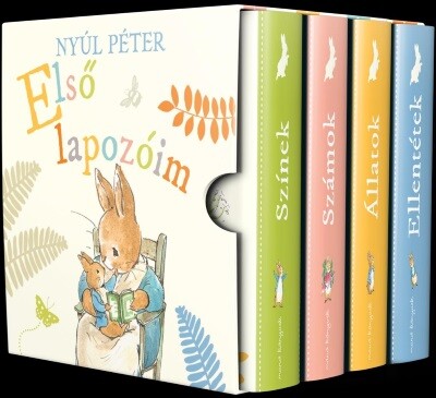Négy kis lapozó egy dobozban a Nyúl Péter és barátaiból jól ismert illusztrációkkal a legkisebbeknek. Színek, számok, állatok és ellentétek.